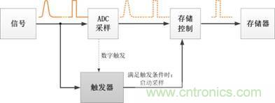 这就要靠触发系统来实现。触发的原理是一直监控信号流,若发现信号满足设定的触发条件,触发器记录满足条件的信号,启动采样;待数据采集完毕后,由控制器对信号进行处理和显示。具体如下图1所示。