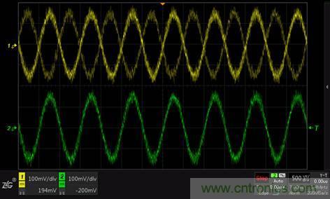 触发耦合其实就是一种对触发信号的低通或高通滤波。因此可对噪声大的信号加入“高频抑制”耦合,过滤掉其中高频部分,使得波形触发稳定如图3所示
