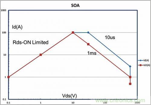 图1.GaN FET SOA曲线示例,此时Rds-On = 毫欧