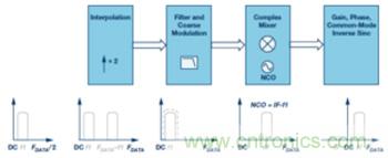 DUC中的NCO和混频器级与DDC中的相同模块非常相似,但功能相反,即根据系统架构的要求,将载波频移到所需的中频或射频频率。在零中频架构中,可旁路此??橐允乖夭ū3衷贒C。
