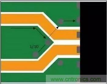 时钟分布或合成器设备路由出来、用于承载相同频率的迹线集群可能相邻而行,因为干扰源音调已经存在于接收器线路上。不过,分组的线路最终会分散。分散时,应在分散线路之间提供接地灌流,并在其开始分散的地方灌入通孔,以便感应回流沿着额定回流路径流回。在图3中,接地岛末端的通孔可使感应电流流到参考层上。接地灌流上其它通孔之间的间隔不要超过一个波长的十分之一,以确保接地不会成为共振结构。
