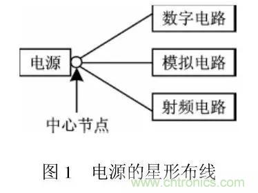 星形布线是模拟电路设计中众所周知的技巧(如图1所示) 。星形布线———电路板上各??榫哂懈髯缘睦醋怨补┑绲缭吹愕牡缭聪呗?。在这种情况下,星形布线意味着电路的数字部分和RF 部分应有各自的电源线路,这些电源线应在靠近IC 处分别去耦。这是一个隔开来自数字