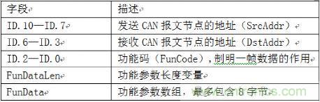 为了给读者演示CAN应用层协议的开发和使用方法,下面定义一个简单的CAN应用协议栈,该协议栈中只用到CAN标准帧中的数据帧,帧ID中的11个位的分配和使用方法如下表所列,协议中另外还定义了功能参数长度变量FunDataLen的功能参数数组FunData,该数组在需要时可以为某些特定功能函数提供足够的控制参数。