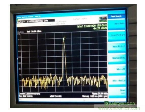 针对辐射问题,我们要寻找出干扰的噪声,使用频谱分析仪在频域分析会更快速精准的找出方案。这里我们使用性价比较高的CXA N9000A频谱分析仪,搭配使用N9311X 套件中的磁场环形探针来扫描手机的近场杂讯。通过使用较低灵敏度的环形探头可以发现在天线区域存在较大的谐波,如图3所示 2.55GHz峰值达到了 -43.29dBm。