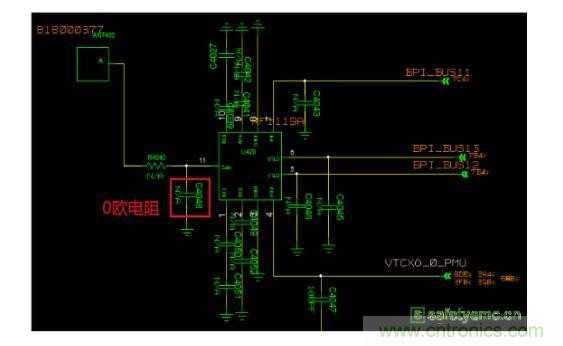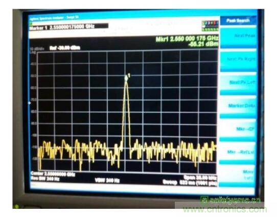 从测试结果来看,谐波超标很严重,这一点与天线区域的杂讯信号很相似,考虑到传导嫌疑已经排除,因此分析的重点集中到了天线区域的非线性器件。从如图4所示原理图可以看出,天线的调谐开关是正常工作的,由于天线开关本身是非线性器件,因此首先确认天线开关的影响。将天线开关旁路(天线仍然正常)如图5所示,发现此时2.55GHz的杂讯可以降低到-55.7dBm左右,因此可以确定天线区域的杂讯就是调谐开关造成的。