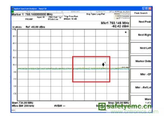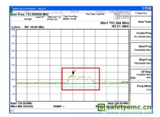 采用此滤波方案后的再进行近场扫描Max Hold的结果可参考图9所示近场辐射结果,此处750MHz附近的近场辐射已经下降到了-92.42dBm,2.25GHz处最大近场辐射下降到了-53.08dBm: