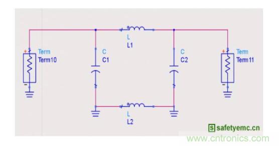 由于2.25GH大约是750MHz的三次谐波,因此我们首先针对750MHz做滤波设计。为了克服这种干扰应该对基带信号加以滤波,阻止高频成分传播和搬移。如图8所示是一种推荐电路,其中电容C1、C2和L2可作为备选,将此电路加在图6黄色框图标示的电源入射端口附近做滤波。