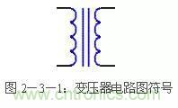 通常直流稳压电源使用电源变压器来改变输入到后级电路的电压。电源变压器由初级绕组、次级绕组和铁芯组成。初级绕组用来输入电源交流电压,次级绕组输出所需要的交流电压。通俗的说,电源变压器是一种电→磁→电转换器件。即初级的交流电转化成铁芯的闭合交变磁场,磁场的磁力线切割次级线圈产生交变电动势。次级接上负载时,电路闭合,次级电路有交变电流通过。变压器的电路图符号见图2-3-1。
