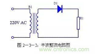 (1)半波整流电路半波整流电路见图2-3-2。其中B1是电源变压器,D1是整流二极管,R1是负载。B1次级是一个方向和大小随时间变化的正弦波电压,波形如图 2-3-3(a)所示。0~π期间是这个电压的正半周,这时B1次级上端为正下端为负,二极管D1正向导通,电源电压加到负载R1上,负载R1中有电流通过;π~2π期间是这个电压的负半周,这时B1次级上端为负下端为正,二极管D1反向截止,没有电压加到负载R1上,负载R1中没有电流通过。在 2π~3π、3π~4π等后续周期中重复上述过程,这样电源负半周的波形被“削”掉,得到一个单一方向的电压,波形如图2-3-3(b)所示。由于这样得到的电压波形大小还是随时间变化,我们称其为脉动直流。