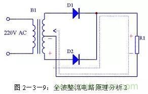 由于半波整流电路的效率较低,于是人们很自然的想到将电源的负半周也利用起来,这样就有了全波整流电路。全波整流电路图见图2-3-6。相对半波整流电路,全波整流电路多用了一个整流二极管D2,变压器B1的次级也增加了一个中心抽头。这个电路实质上是将两个半波整流电路组合到一起。在0~π期间B1次级上端为正下端为负,D1正向导通,电源电压加到R1上,R1两端的电压上端为正下端为负,其波形如图2-3-7(b)所示,其电流流向如图2-3-8所示;在π~2π期间B1次级上端为负下端为正,D2正向导通,电源电压加到R1上,R1两端的电压还是上端为正下端为负,其波形如图2-3-7(c)所示,其电流流向如图2-3-9所示。在2π~3π、3π~4π等后续周期中重复上述过程,这样电源正负两个半周的电压经过D1、D2整流后分别加到R1两端,R1上得到的电压总是上正下负,其波形如图2-3-7(d)所示。
