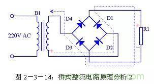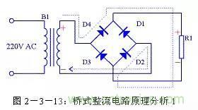 由图2-3-13可以看出在电源正半周时,B1次级上端为正,下端为负,整流二极管D4和D2导通,电流由变压器B1次级上端经过D4、R1、D2回到变压器B1次级下端;由图2-3-14可以看出在电源负半周时,B1次级下端为正,上端为负,整流二极管D1和D3导通,电流由变压器B1次级下端经过 D1、R1、D3回到变压器B1次级上端。R1两端的电压始终是上正下负,其波形与全波整流时一致。