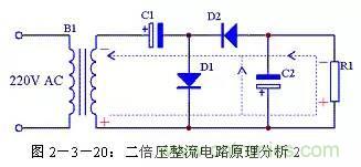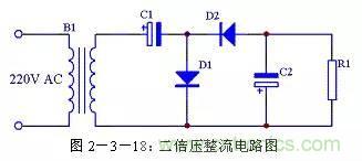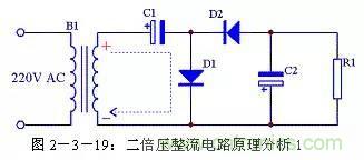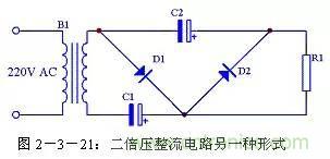 二倍压整流电路还有另外一种形式的画法,见图2-3-21,其原理与图2-3-18完全一致,只是表现形式不一样。