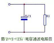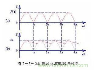 (1)电容滤波电路电容滤波电路图见图2-3-23,电容滤波电路是利用电容的充放电原理达到滤波的作用。在脉动直流波形的上升段,电容C1充电,由于充电时间常数很小,所以充电速度很快;在脉动直流波形的下降段,电容C1放电,由于放电时间常数很大,所以放电速度很慢。在C1还没有完全放电时再次开始进行充电。这样通过电容C1的反复充放电实现了滤波作用。滤波电容C1两端的电压波形见图2-3-24(b)。