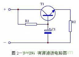 当对滤波效果要求较高时,可以通过增加滤波电容的容量来提高滤波效果。但是受电容体积限制,又不可能无限制增大滤波电容的容量,这时可以使用有源滤波电路。其电路形式见图2-3-29,其中电阻R1是三极管T1的基极偏流电阻,电容C1是三极管T1的基极滤波电容,电阻R2是负载。这个电路实际上是通过三极管T1的放大作用,将C1的容量放大β倍,即相当于接入一个(β+1)C1的电容进行滤波。