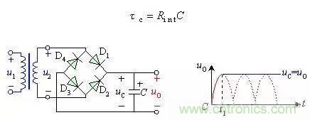 式中包括变压器副边绕组的直流电阻和二极管的正向导通电阻。由于一般很小,电容器很快就充到交流电压u2的最大值,如波形图2(b)的时刻。此后,u2开始 下降,由于电路输出端没接负载,电容器没有放电回路,所以电容电压值uC不变,此时,uC>u2,二极管两端承受反向电压