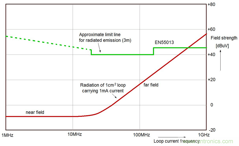 举例而言,一个1cm²的电流环,其中的电流为1mA,电流变化频率为100MHz,则距离此电流环3m处的场强为4.4µV/m,或说是12.9dBµV。