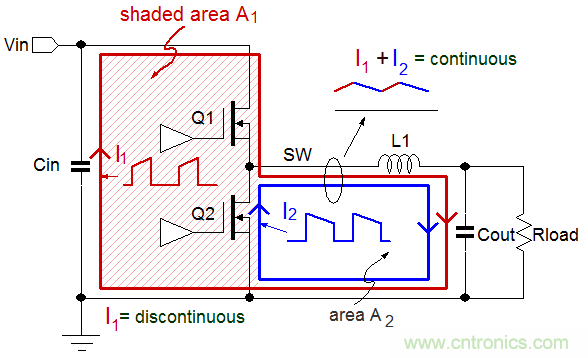从电磁辐射的角度来看,图3中存在阴影的A1区域是存在高电流变化率dI/dt的回路部分,这个回路将生成最多的高频成分,因而在Buck转换器的EMI设计中是需要被重点考虑的最关键部分。图中A2区域的电流变化率dI/dt就没有A1区域的高,因而生成的高频噪声也就比较少。