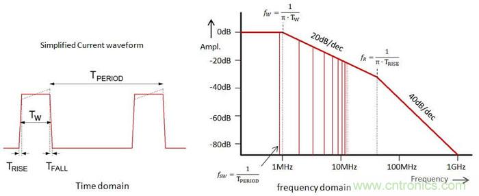 为了理解这能导致多大程度的改进,我们需要对不连续电流脉冲的高频成分进行一番探讨。图6左侧显示的是简化为梯形了的电流波形,其周期为TPERIOD,脉冲宽度为TW,脉冲上升/下降时间为TRISE。从频域来看此信号,其中含有基频成分和很多高次谐波成分,通过傅里叶分析可以知道这些高频成分的幅度和脉冲宽度、上升/下降时间之间的关系,这种关系被表现在图6的右侧。