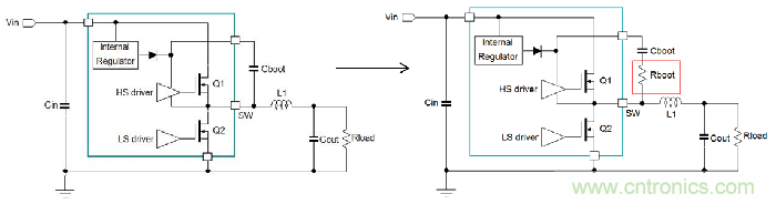 在MOSFET外置的设计中,电阻可被串接到上桥MOSFET的栅极上,这就可以同时增加上桥的导通时间和截止时间。