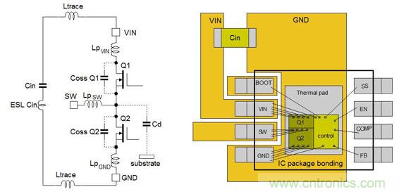 图8显示出了一个常规设计中的Buck转换器IC中的寄生元件。