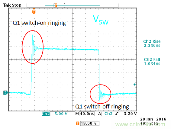 添加RC缓冲电路可有效地抑制振铃现象,同时会造成开关切换损耗的增加。