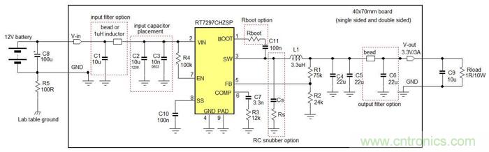 本章将示范在Buck转换器的EMI设计中的不同方法所导致的影响。示范所使用的IC是RT7297CHZSP,一款800kHz工作频率、3A输出能力的电流模式Buck转换器,采用PSOP-8封装。测试中的电路工作在12V输入下,输出为3.3V/3A,测试所用电路显示在图12中。