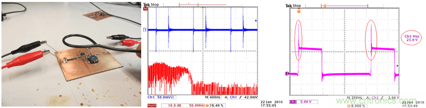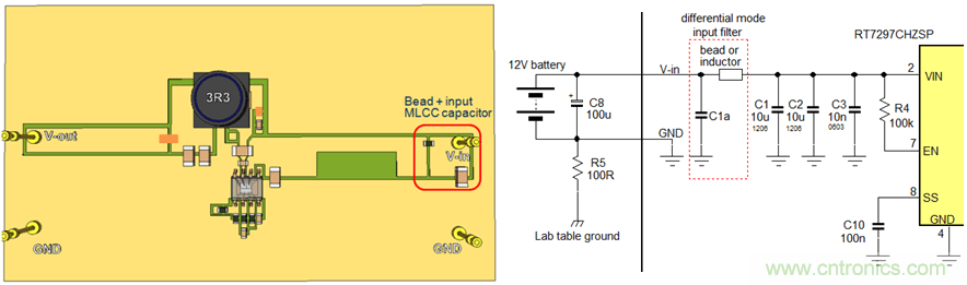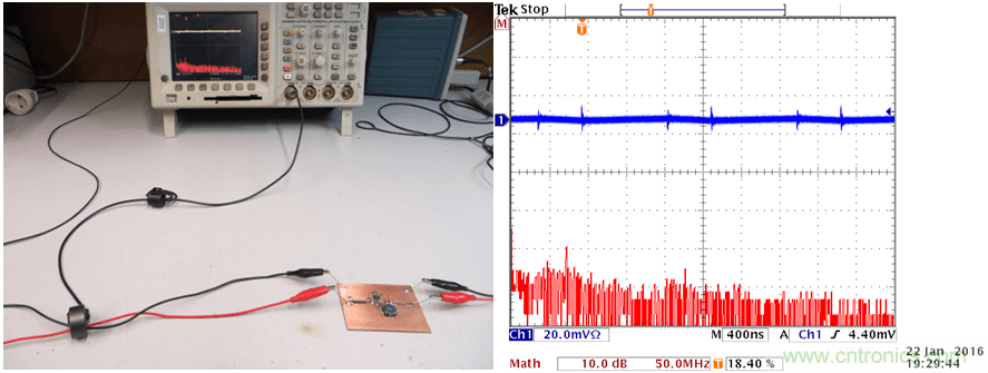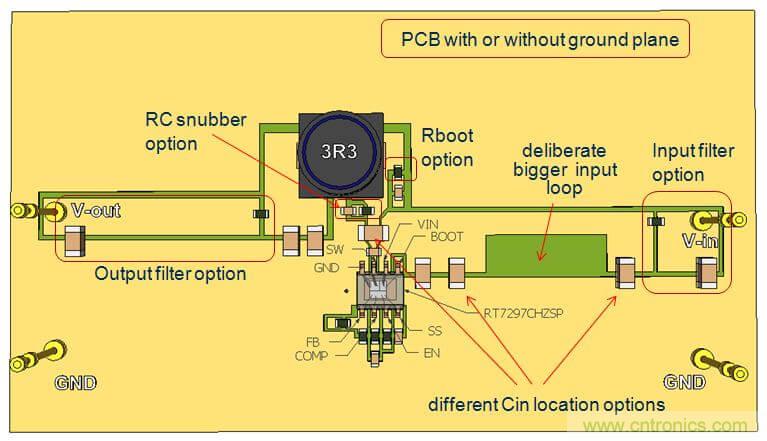 在此实验中,我们使用双面PCB,输入电容的放置位置如上面的实验2一样,这样的配置可以在输入回路中引入比较明显的辐射。