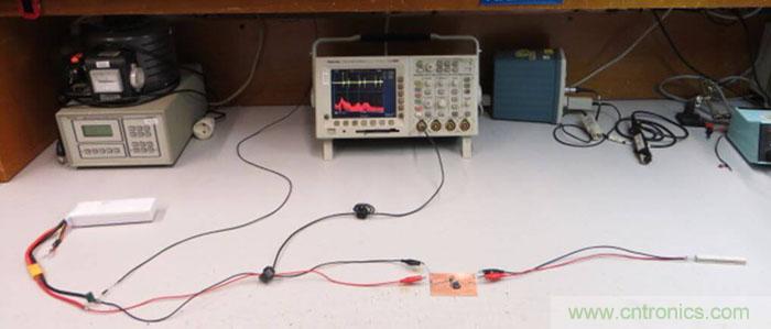 输入线靠电池一侧的接地端通过一只100Ω的电阻和实验台的地连接在一起,这就给整个电路提供了一个参考地,其阻抗很像EMC测试中的LISN网络。