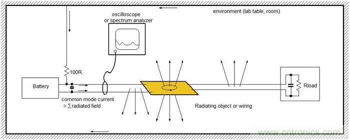 当被测试对象被放在实验桌上时,其PCB上的电流回路和导线就会向周围环境辐射出高频能量,这些辐射信号又会自己找到路径返回到测试对象上,并以高频共模电流的形式出现在供电线上。这些供电线上的高频共模电流会和板上的电流结合在一起,可被用着辐射状况的指示信号。