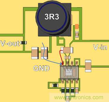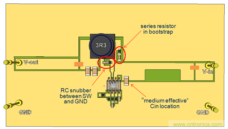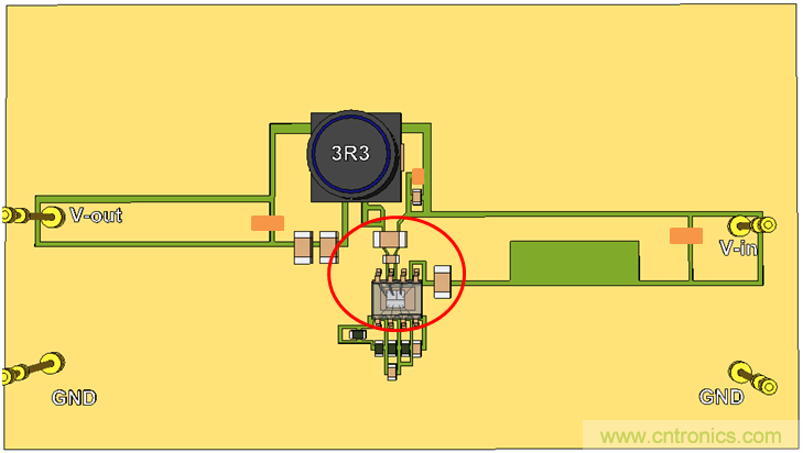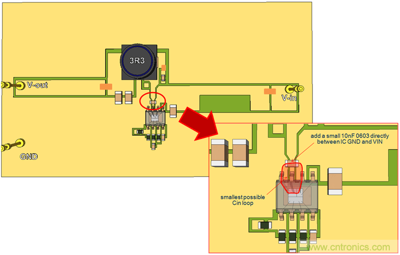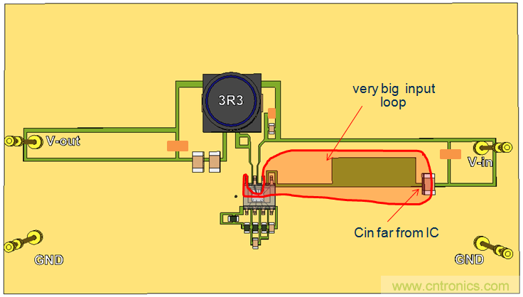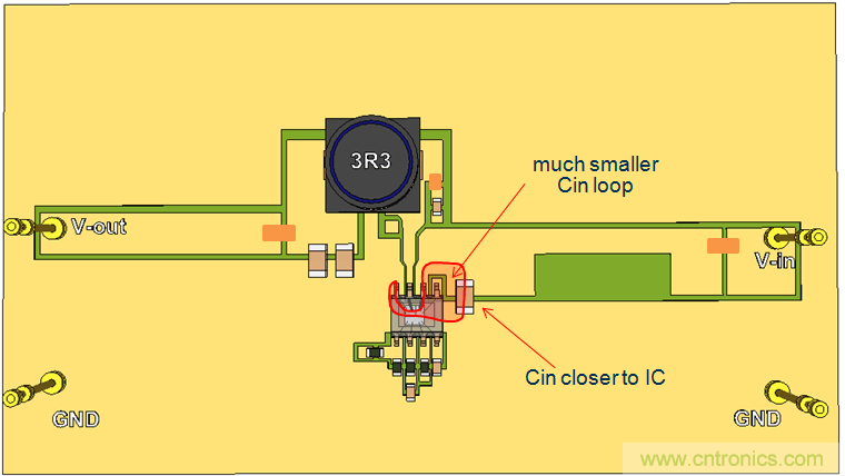 我们继续使用单面PCB,并将CIN放置到靠近IC的地方,这样就形成了比较小的CIN回路。参见图20。