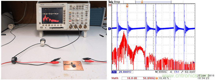 这种环形天线可以被连接到频谱分析仪上,当你使它在PCB上方移动时,你就可以看到哪里会有比较强的高频磁场。你也可以把它连接到一台示波器上(使用50Ω的端子),示波器上就可以显示出相应区域的切换噪声水平。保持天线环和板子之间的相对位置和距离不变,对电路、PCB上的回路做出某些改变,你就可以知道噪声水平在增加或是减少。