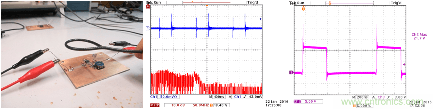 转换器的电源输入来自于三只串联的锂离子电池,电压大约为12V,这就使它们和实验室里的其他设备没有了直接联系。一只电解电容跨接在电池的引线上,这可消除电池电感可能导致的谐振问题。