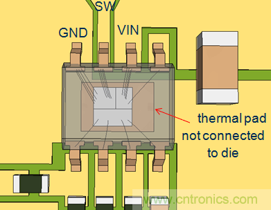 在RT7297CHZSP中,芯片底部的散热焊盘是没有和晶圆内核连接在一起的,所以在PCB布局中将铜箔和散热焊盘连接在一起并不能缩短CIN回路。它的上桥MOSFET和下桥MOSFET通过多根邦定线连接到VIN和GND端子,因而可以通过这两个端子形成最短的回路。