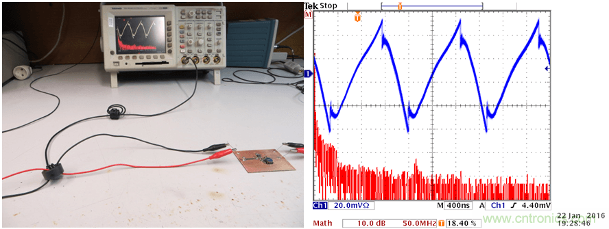 电源输入线上的高频电流由差模电流和共模电流构成。对于共模电流,可以在PCB布局设计时将具有高电流变化率dI/dt的电流环最小化予以消减。而差模电流则有不同的来源,我们可以如图27那样将正、负两条线以不同方向穿过自制的电流探头的磁芯来进行测量。