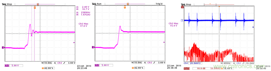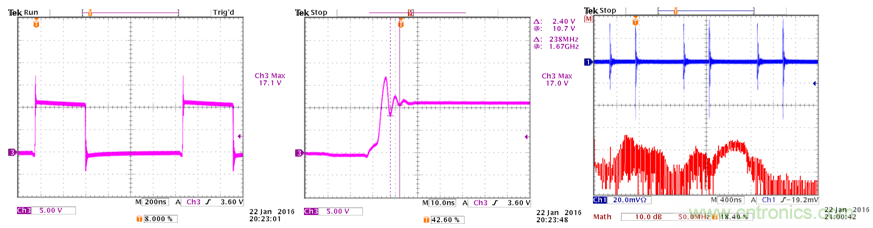 开关切换波形显示出5V的过冲,过冲信号的振荡频率为238MHz;输入线上的共模电流显示出明显的高频噪声。参考图33。