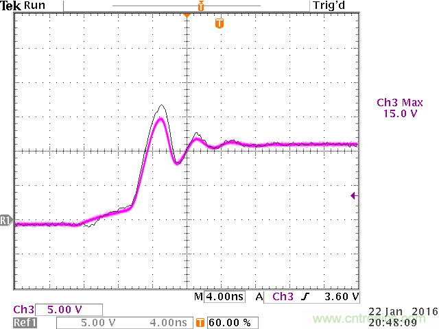 从实验结果来看,开关切换波形上的过冲实际上已经消失了,但还存在低频的振铃信号。
