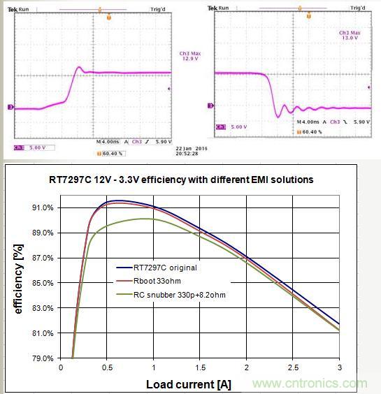 当使用了RC平滑抑制电路以后,应当确保要对电路的总功率损失进行检查。转换器的效率是必然会下降的,这在开关切换工作频率很高和输入电压很高的时候表现尤甚。