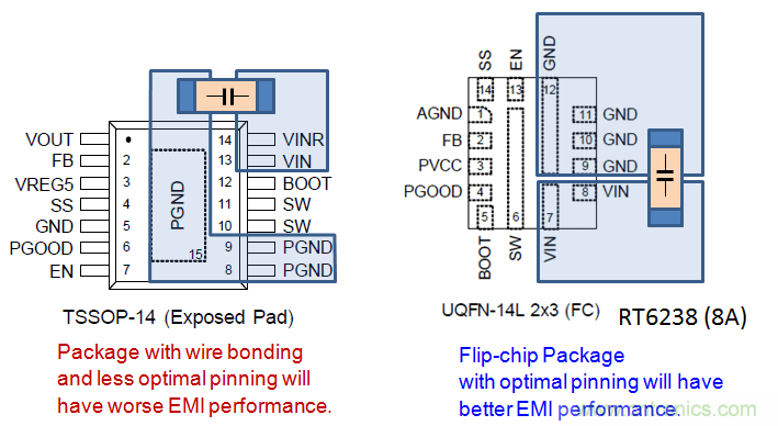 在噪声敏感的应用中,最好是选择小型封装的、电感很低的晶圆倒装芯片。