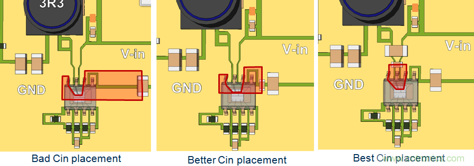 确定开关切换回路的VIN和GND节点位置,将不同尺寸的输入电容尽可能靠近这些节点,最小的电容靠节点的位置要最近。由于这个切换回路承载了很高的电流变化率dI/dt,因而需要尽可能地小。
