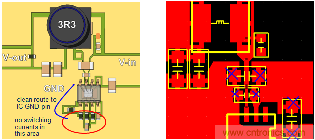 将输出电容地放在不与输入电容切换路径发生重叠的地方,避免高频噪声串入输出电压中。