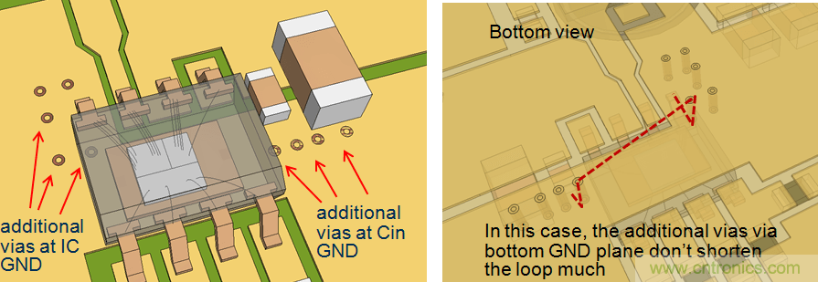 在上面的例子中,通到地线层的附加导通孔对缩减CIN回路的长度没有帮助。但在另一个例子中,由于顶层的路径很长,通过导通孔来缩小回路面积就十分有效。