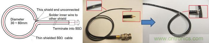 其实我们是有可能在实验室环境下对产品原型进行一些基本的EMI测试的,还可对系统的各个??榉直鸾小U庋牟馐酝ǔJ粲诮』肪常ú饬烤嗬?< 0.16λ),因而在测试电流回路的辐射状况时需要使用小型的环形天线来对高频磁场进行测量。你可以使用一段50Ω的同轴电缆自己制作小型的拥有电屏蔽的环形天线,这看起来并不是一件很难的事情,可参考图43的示意进行。
