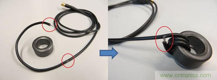 为了将测试工具和测试对象隔离开,最好是在电缆上加一个共模线圈,这可通过将引入分析装置的电缆多次穿过一个扣合式的EMI铁芯来实现。