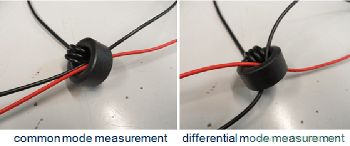 将电源线的正、负两条线以同一个方向穿过铁芯可测量其中的共模电流,颠倒其中一条线的方向则可测量差模电流。参见图45。