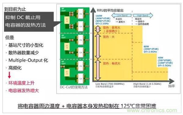 但是,近年来随着Multiple-Output化(Tx增加)加速,一方面元件数量增加,而由于基站尺寸小型化,散热器等散热对策可用的空间越来越少。使用频带的进一度高频化,元件发热进一步增大,将电容器周边温度和自身发热抑制在125℃,在电路设计上的制约案例中变得尤为显著。