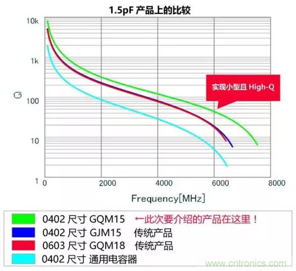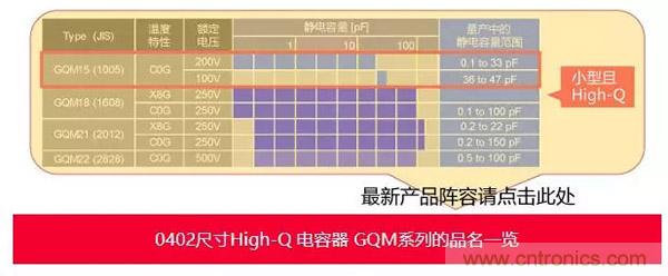 村田制作所的High-Q电容器除传统的0603尺寸外,还新增0402尺寸到产品阵容。通过独创的构造、材料,即使静电容量值很低,与标准规格产品(GRM系列)相比,也可实现高Q值。因兼具匹配用电容器的小型化和高Q值,有助于实现高频PA电路设计的高密度化。