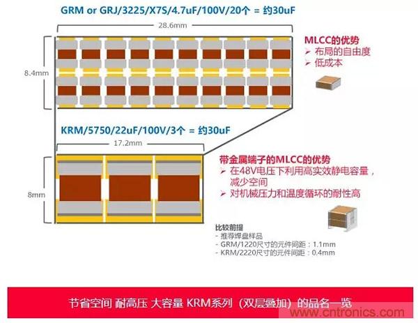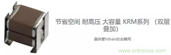 村田制作所将通过使用双层叠加MLCC,获得小占用面积大静电容量的带有金属端子的电容器增至产品阵容。大型(2220)尺寸的片状多层陶瓷电容器可以不用担心由于机械压力产生的裂纹和温度循环产生的焊接裂纹。通过金属端子吸收压力,成功将风险控制到超小。通过实现晶体管Vdrain去耦用电容器节省空间和大容量的特性,能够提高设计的自由度。