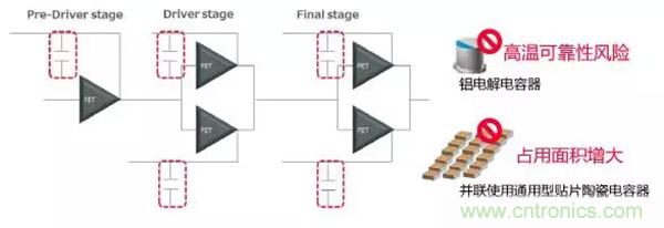 电解电容器具有每个都能获得大的静电容量的好处,但因在类似基站PA这样的高温、在长时间连续工作的环境下存在可靠性方面的风险,所以不受欢迎。现在Vdrain的晶体管用电容器多采用通过将10~20个1210尺寸的多层陶瓷电容器(125℃保证、50Vdc~100Vdc、4.7uF~10uF)并列连接,保证静电容量的设计。