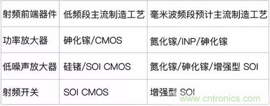 以功率放大器为例,目前主流的功率放大器制造材料为砷化镓,但在毫米波频段,氮化镓及InP的制造工艺在性能指标上均要强于砷化镓。下表所示为从低频到毫米波段主要的射频前端器件制造工艺上的发展方向。
