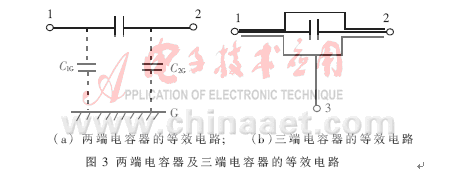 一般情况下,电阻、电感和电容等电子元件均被看作双端元件。两端电容器的等效电路示如图3(a)。由于各端钮对附近导电物体的分布电容C1G、C2G是变化的,
